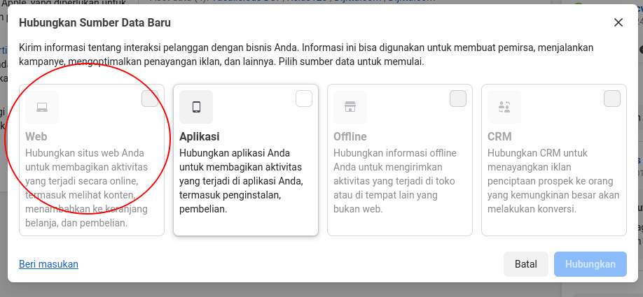 Pertama yang harus kita lakukan adalah membuat Pixel dengan masuk ke dalam Facebook dan menu Pengelola Peristiwa